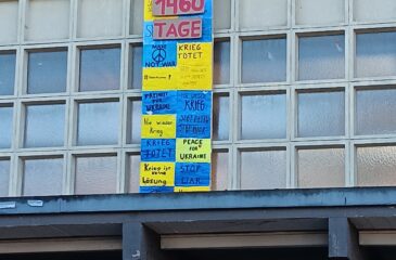 Eine Gruppe von Schüler:innen hatte dieses Banner beim Überfall auf die Ukraine 2022 spontan gestaltet und aufgehängt. Damals dachte niemand an eine solch lange Kriegszeit. Jetzt sind es schon über 1461 Tage! Wir denken an die Menschen in der Ukraine.