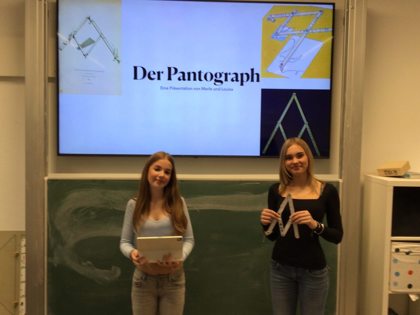 Im Zuge des 9er Mathematikunterrichts bei Herrn Termaat zum Thema Ähnlichkeit und zentrische Streckungen haben Louisa und Merle aus der 9a einen Pantographen gebaut, welcher seit dem 17. Jahrhundert vielfältig in Kunst, Technik und Kartografie eingesetzt worden ist. Seine Funktionsweise demonstrierten die zwei Schülerinnen in einem interessanten Referat.