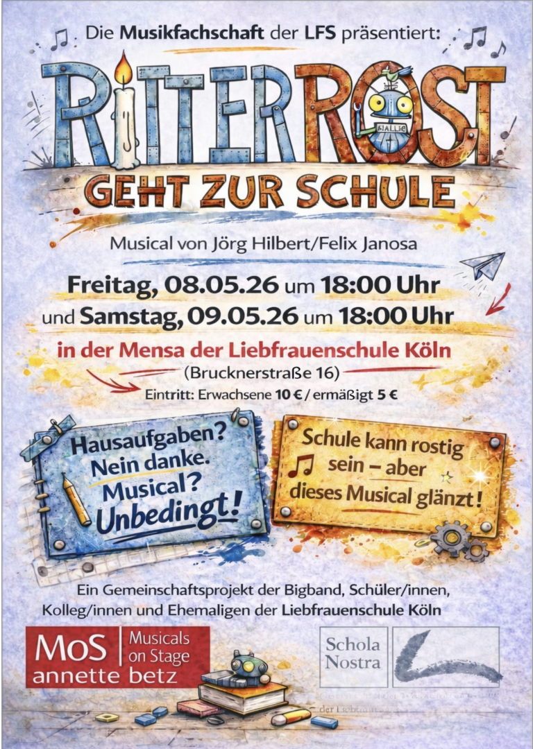die Spatzen pfeifen es schon von den Dächern der eisernen Burg im Fabelwesenwald: In diesem Jahr wird ein ganz besonderes musikalisch-kabarettistisches Projekt auf die Bühne gebracht, das unterhaltsam, lustig und nachdenklich zugleich ist. Die Fachschaft Musik hat gemeinsam mit der Bigband der LFS eine Gemeinschaft aus aktuellen und ehemaligen Schüler/innen sowie aktuellen und ehemaligen Kolleg/innen zusammengestellt, die das Musical “Ritter Rost geht zur Schule”von Felix Janosa und Jörg Hilbert an zwei Abenden mit freundlicher Unterstützung der Schola Nostra aufführen wird.