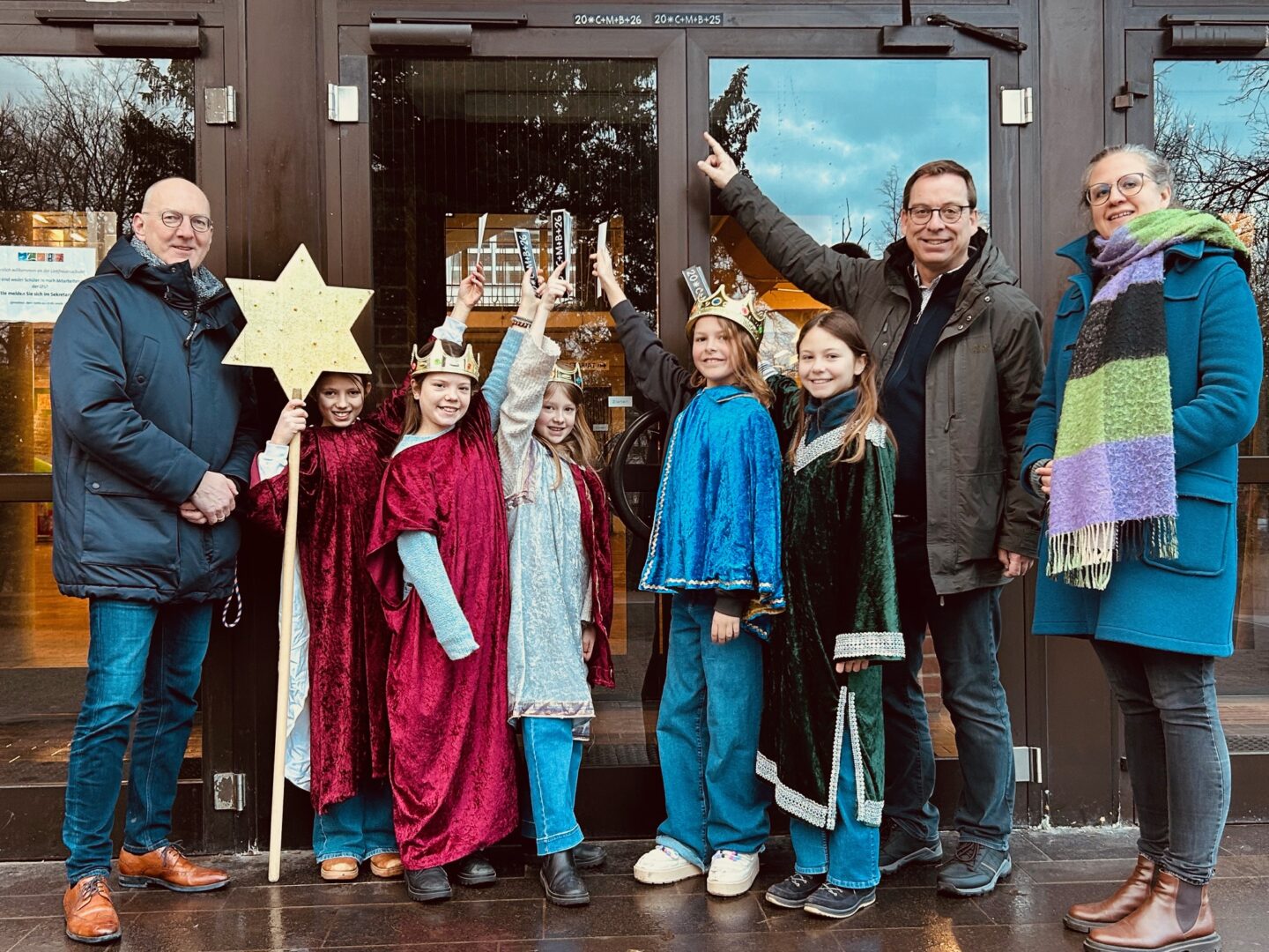 Die Klasse 5c informierte ihre Mitschülerinnen und Mitschüler darüber, dass die gesammelten Spenden für Projekte verwendet werden, die Kindern ermöglichen, eine Schule zu besuchen anstatt in einer Fabrik arbeiten zu müssen. Alle Fünftklässler hatten die Möglichkeit, ihr Spendenkästchen abzugeben. Die Kollekte erzielte den tollen Betrag von 643,70 €. Wir danken allen Fünftklässlern, die mit ihrer Spende zu diesem großartigen Ergebnis beigetragen haben. Im Anschluss an den Gottesdienst brachten die Sternsingerinnen auch unserer Schule den Segen, worüber sich unsere Schulleitung Herr Strohmeier und Frau Dr. Tröger sowie unser Schulseelsorger Herr Hofer sehr gefreut haben. Über den Eingangstüren der Schule hängt jetzt der Segensspruch: „20*C+M+B+26“. Dieser Spruch steht für die lateinischen Worte: „Christus mansionem benedicat“, was übersetzt bedeutet: „Jesus Christus segne dieses Haus im Jahre 2026.“ Dieser Zuspruch Gottes möge allen, die in diesem Jahr unsere Schule betreten, Kraft, Freude und Zuversicht schenken.