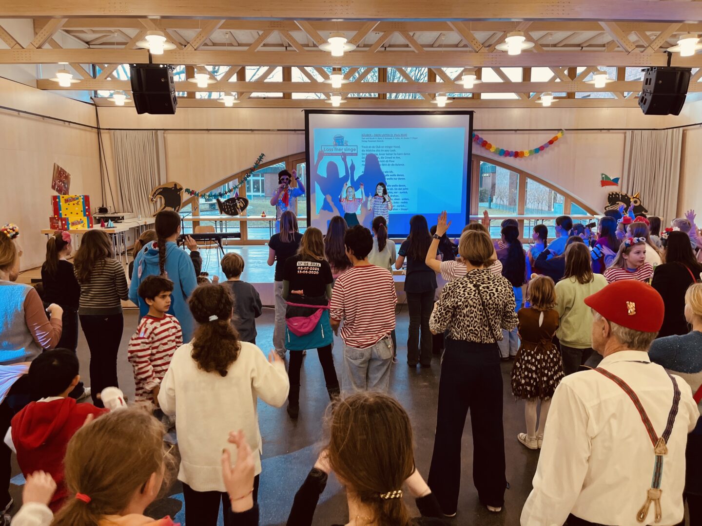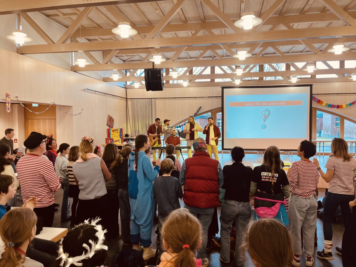 So erschienen trotz kurzfristiger Ankündigung Jeck/innen vun janz klein bis janz jroß, kamen die Schüler/innen aller Musik-Ensembles mitsamt einiger Eltern un Jrooß, Lehrkräfte (met un ohne Fammilich) bis hin zu Schulleitung und Sekretariat sowie Lück us d´r Nohberschaff, um sich in der Mensa in den Karneval einzusingen und zu tanzen. Nicht nur dank der Choreo der 6e oder den flotten Sprüchen des Moderators Harbecke kam ordentlich Stimmung auf, sondern insbesondere dank des Surprise Acts Lupo, der mit seinem 2020 zweitplatzierten Hit „För die Liebe nit“ (und der vom Publikum vehement eingeforderten Zugabe) selbst die hinteren Reihen zum Mitschmettern brachte.