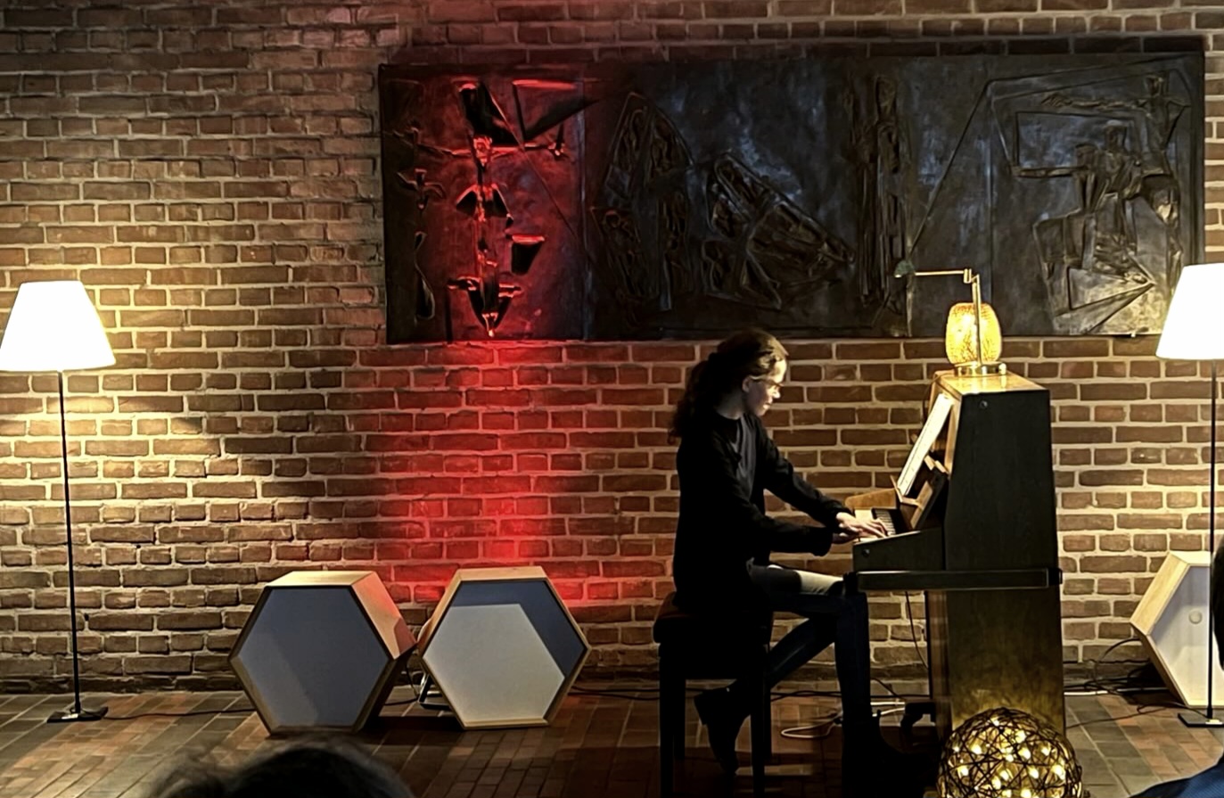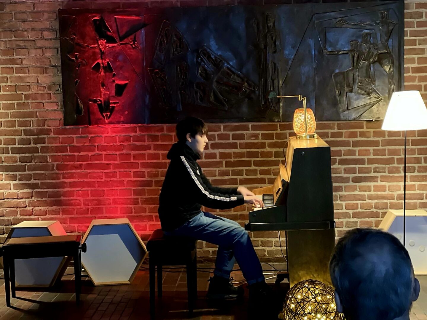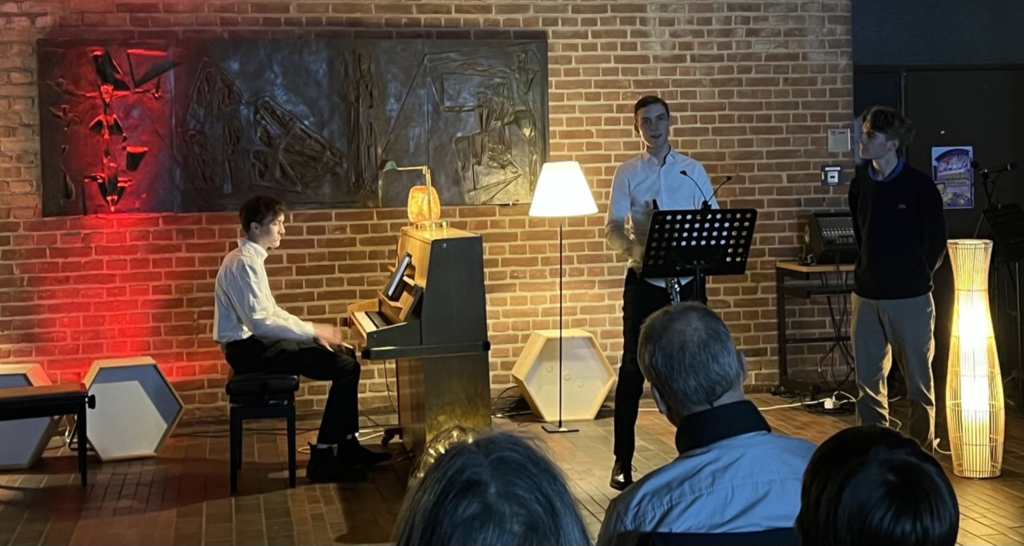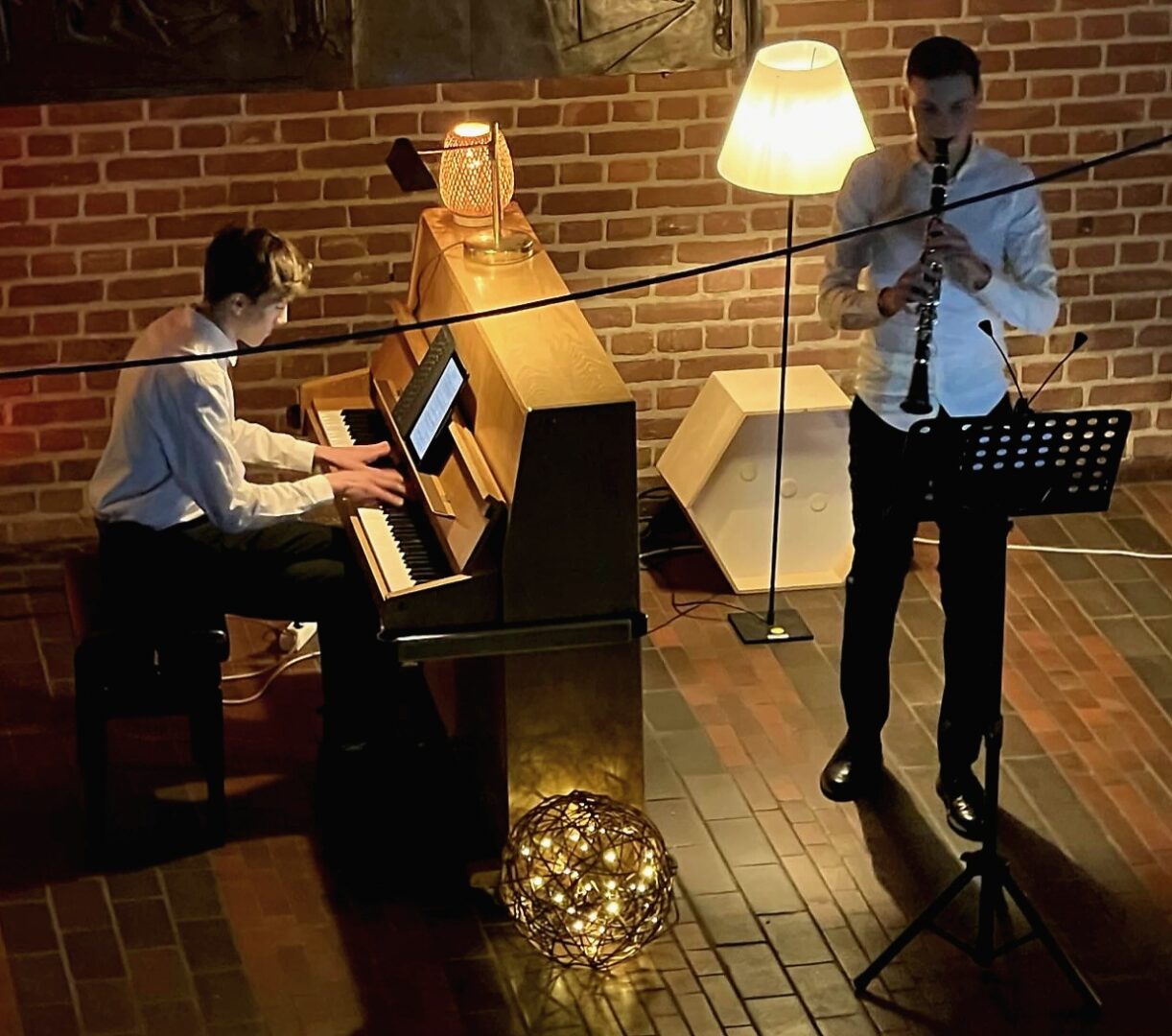 In gemütlichem Wohnzimmerambiente erklang ein breitgefächertes Repertoire mit Werken von Bach, Schubert, Brahms, Grieg, Skrjabin, Gershwin und anderen. Neben vielen, teils vierhändigen Klavierbeiträgen waren als Instrumente auch Gitarre und ein Bläser-Trio zu hören. Besonders hervorgehoben sei der von Jakob-Arda Satir (Q1) komponierte, dreiteilige Zyklus „Lieder ohne Worte“ für Klarinette und Klavier, den er gemeinsam mit Valentin Gau (Q1) einem begeisterten Publikum darbot.