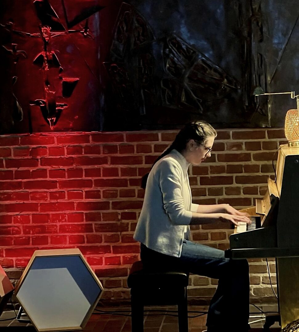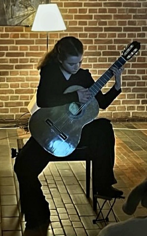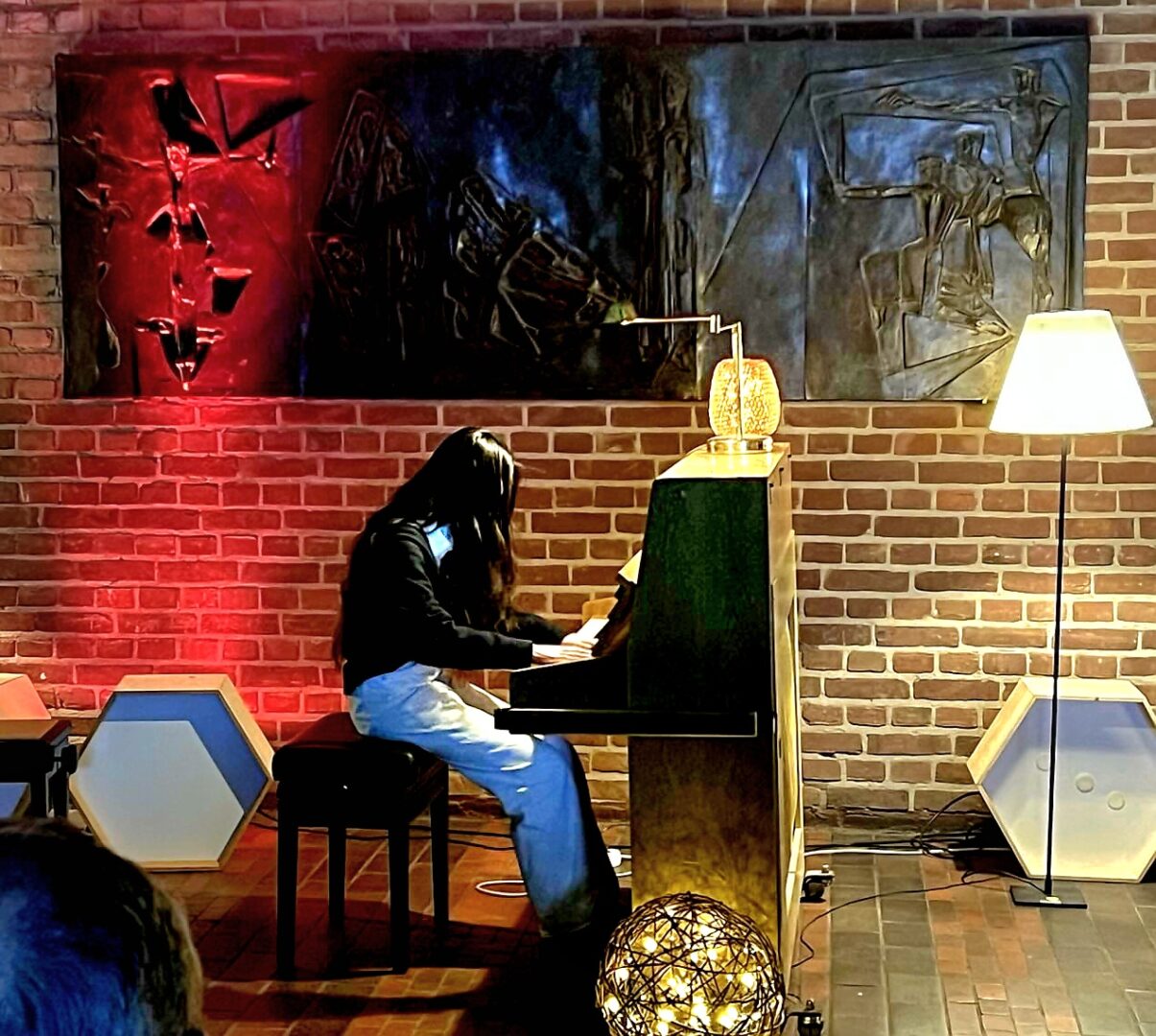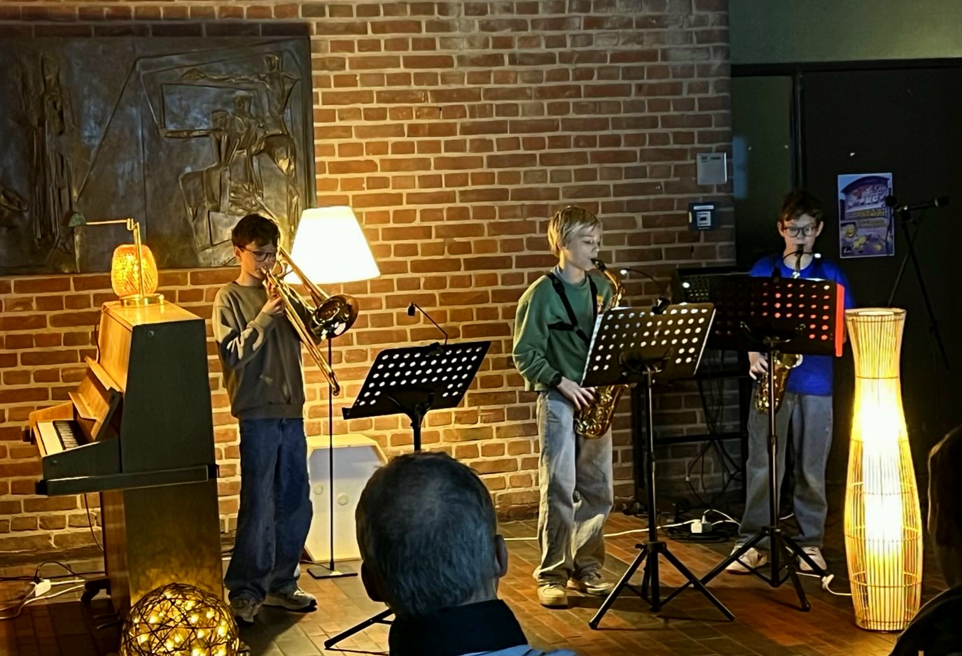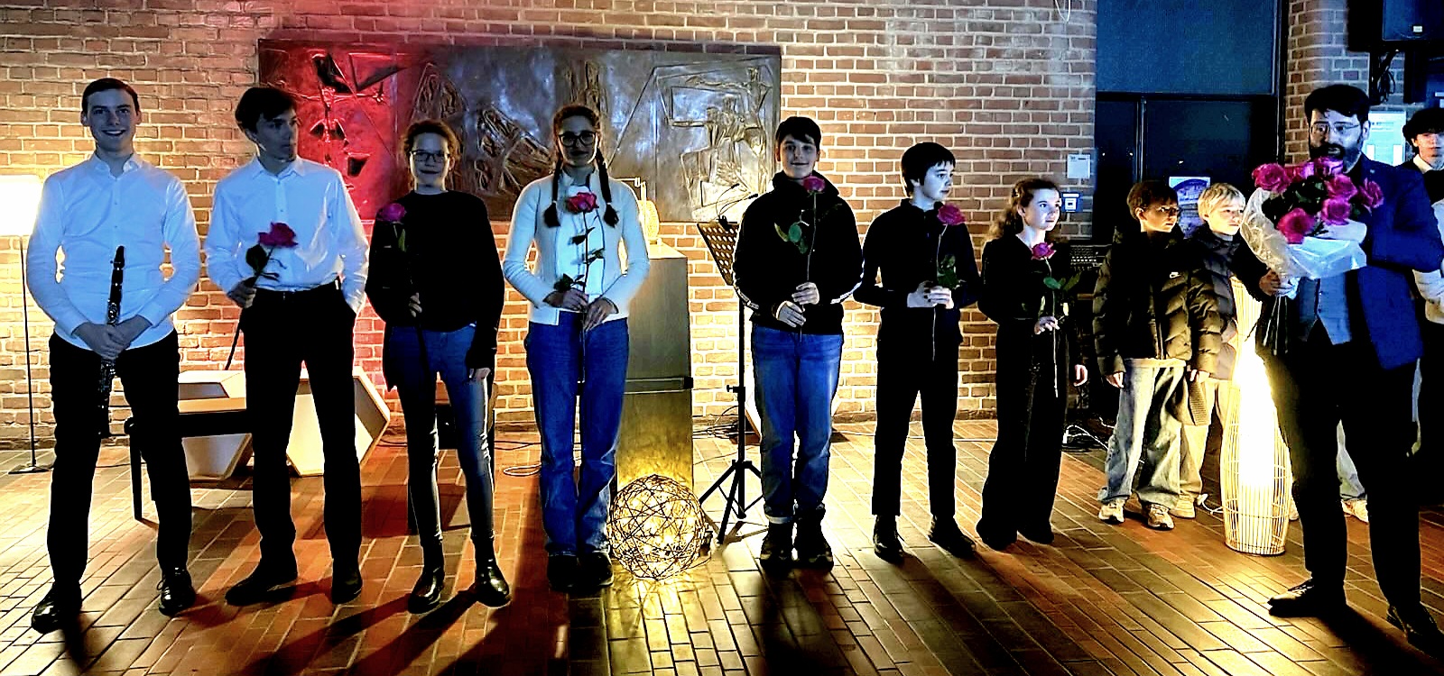 In gemütlichem Wohnzimmerambiente erklang ein breitgefächertes Repertoire mit Werken von Bach, Schubert, Brahms, Grieg, Skrjabin, Gershwin und anderen. Neben vielen, teils vierhändigen Klavierbeiträgen waren als Instrumente auch Gitarre und ein Bläser-Trio zu hören. Besonders hervorgehoben sei der von Jakob-Arda Satir (Q1) komponierte, dreiteilige Zyklus „Lieder ohne Worte“ für Klarinette und Klavier, den er gemeinsam mit Valentin Gau (Q1) einem begeisterten Publikum darbot.
