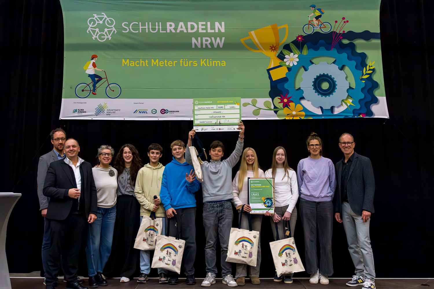 Am Mittwoch, den 26.11. sind Laurin, Dominik, Lea, Emilia und Niklas aus der Klasse 8d gemeinsam mit Frau Henn in die Abenteuerhalle nach Kalk gefahren. Dort waren sie als Vertreter/innen der Liebfrauenschule eingeladen zur landesweiten Preisverleihung des Wettbewerbs SCHULRADELN, der für klimafreundliche und gesundheitsfördernde Mobilität wirbt. Schüler/innen und Lehrer/innen aus ganz NRW waren angereist, um dort eine Auszeichnung für ihre erfolgreiche Teilnahme an dem Wettbewerb entgegenzunehmen und außerdem in den Genuss eines leckeren Buffets und eines bunten Rahmenprogramms zu kommen. So durften die Schüler/innen nach der Preisverleihung noch BMX fahren, Klettern und Akrobatik machen. Besonders gefreut haben sich die Vertreter/innen der Liebfrauenschule auch über 1000 € Preisgeld für den 1. Platz in der Kategorie „Geloste weiterführende Schule mit mindestens 20000 Fahrradkilometern“. Also: Fahrradfahren lohnt sich!